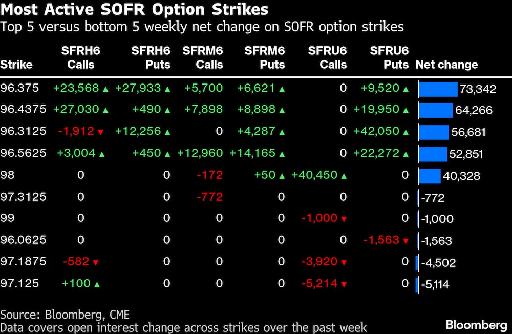 Los cambios en el interés abierto en las opciones SOFR de marzo, junio y septiembre durante la última semana generaron un gran aumento de riesgo en varias opciones de venta de septiembre 26, debido principalmente a las fuertes compras en opciones de venta SFRU6 de 96,4375/96,3125/96,1875, con precios entre 2,25 y 2,5, principalmente el jueves pasado. La semana pasada también se observó un buen potencial alcista en las opciones de compra de marzo, siendo las opciones de compra SFRH6 de 96,375/96,4375/96,50 una opción popular.