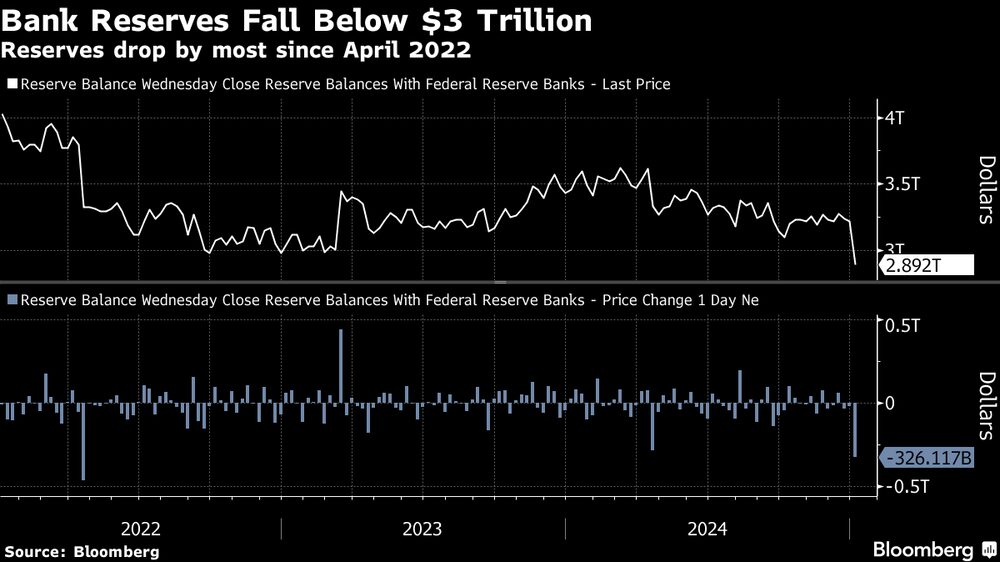 Las reservas bancarias cayeron en unos US$326.000 millones en la semana transcurrida hasta el 1 de enero, hasta los US$2,89 billones, según los datos de la Reserva Federal publicados el jueves. Es la mayor caída semanal en más de dos años y medio.