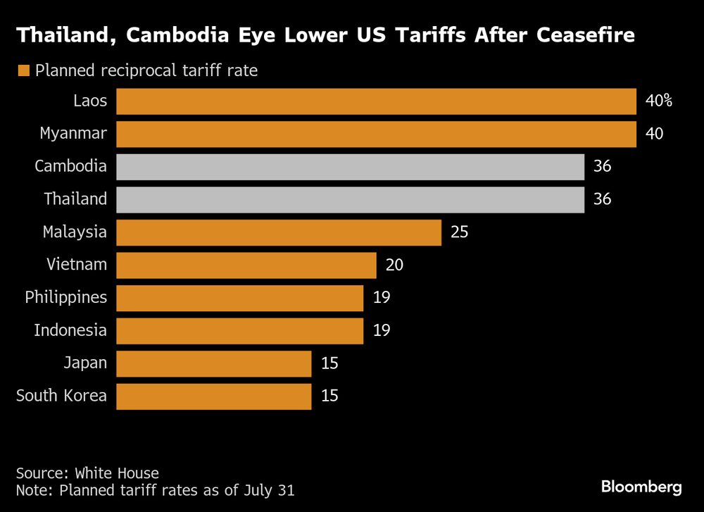 Tailandia y Camboya se enfrentan a una tasa arancelaria del 36% a partir del 1 de agosto sobre sus mercancías a EE.UU., su mayor mercado de exportación. Las economías dependientes del comercio estaban bajo presión para evitar el fuerte gravamen, especialmente después de que las vecinas Indonesia y Filipinas se aseguraran tasas del 19% y Vietnam del 20%.