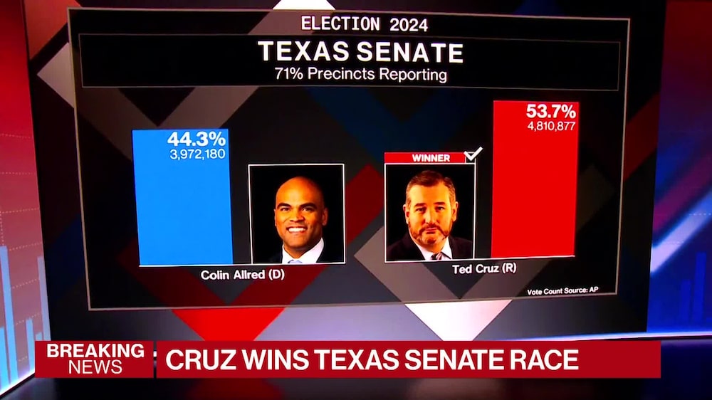 Cruz derrotó al representante Colin Allred, según las proyecciones de NBC News y Fox News. Su ventaja era de unos 9 puntos porcentuales, con el 68% de los votos escrutados, según los resultados no oficiales de Associated Press. En su última contienda en 2018, Cruz superó al excongresista Beto O’Rourke por 2,6 puntos porcentuales.