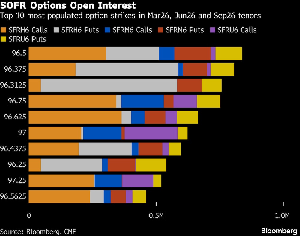 Incluso mientras el mercado de swaps sigue mostrando expectativas de recortes de medio punto en 2026, el reciente flujo de opciones vinculadas a la tasa de financiación a un día asegurado, o SOFR, que está estrechamente ligado al índice de referencia a corto plazo de la Fed, está contando una historia más dura.