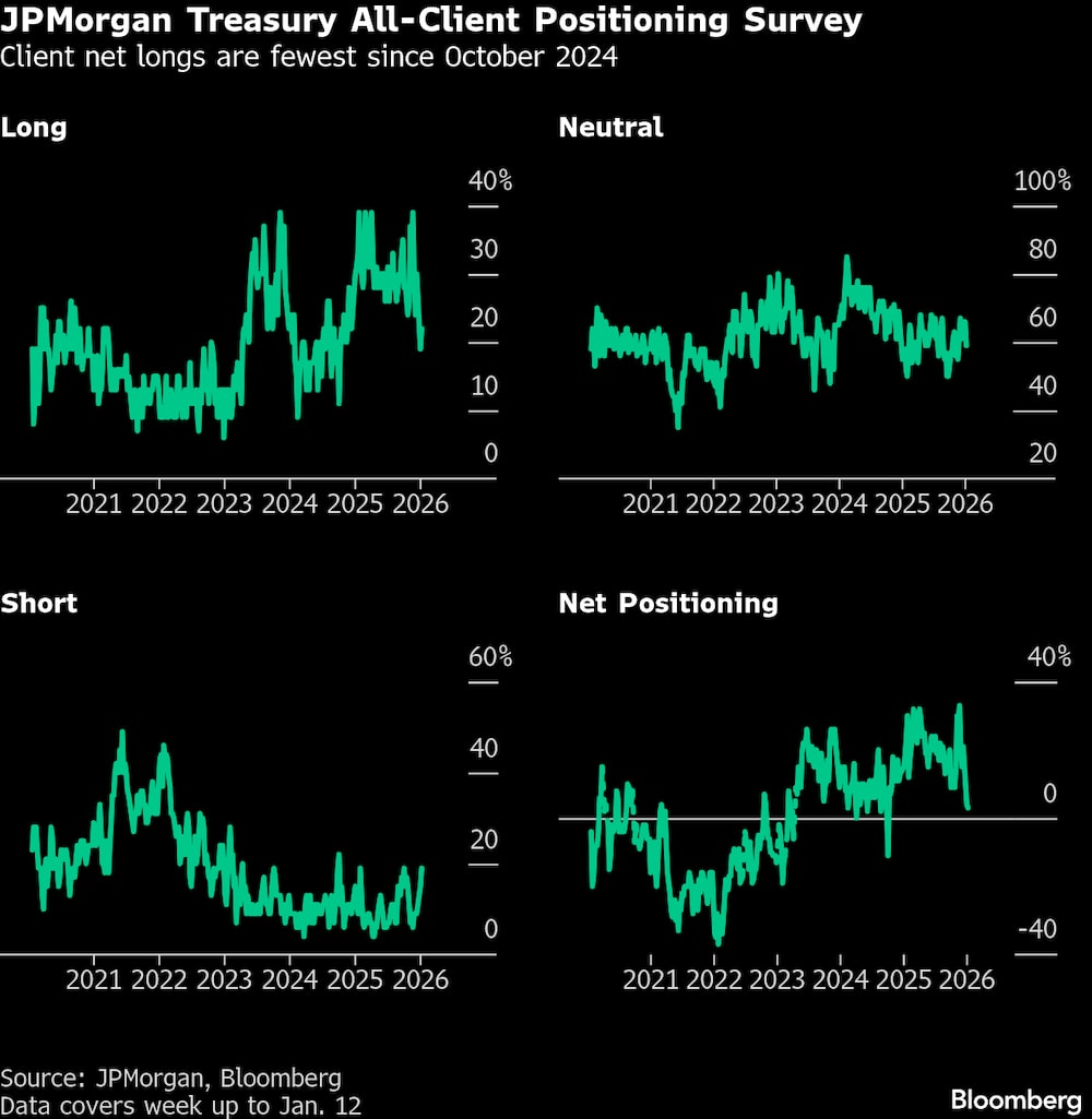 Una encuesta de JPMorgan sobre los cambios de posición de los clientes durante la semana que finalizó el 12 de enero, mostró que las posiciones cortas aumentaron 4 puntos porcentuales y las largas 3 puntos porcentuales. El resultado es la menor cantidad de posiciones largas netas desde octubre de 2024 y la mayor cantidad de posiciones cortas desde el 6 de octubre del año pasado.