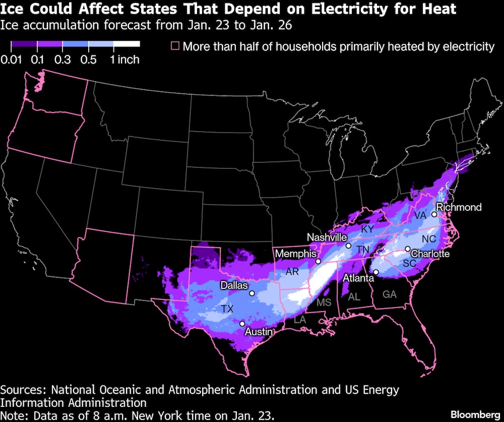 Una amplia franja del Sur, desde Luisiana y Arkansas hasta los Montes Apalaches, se enfrenta a “impactos catastróficos” por la lluvia helada y el hielo, advirtió el Centro de Predicción Meteorológica de EE.UU.