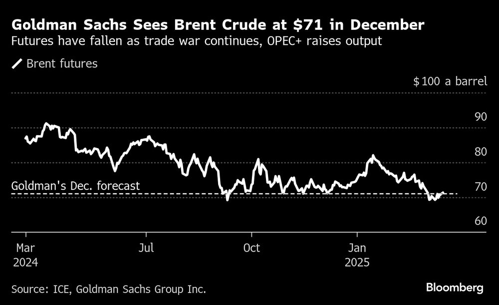 Bloomberg — Goldman Sachs Group Inc. (GS) recortó sus previsiones sobre el precio del petróleo, ya que los aranceles reducen las perspectivas de crecimiento de EE.UU. mientras que la OPEP y sus aliados aumentan la producción.