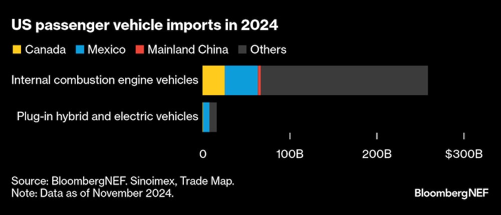 Los vehículos eléctricos eran más caros que los vehículos con motor de combustión interna incluso antes de que Trump empezara a amenazar con aranceles y se encarecerían con ellos, a ambos lados de la frontera. Pero como los vehículos tradicionales de gasolina contienen más piezas que cruzan la frontera que los VE, los aranceles sobre los automóviles podrían hacer subir más esos precios, lo que daría una ventaja a los VE, según la investigación de BloombergNEF.