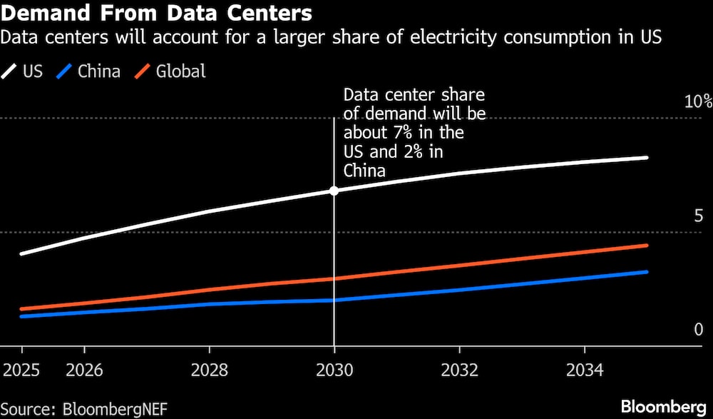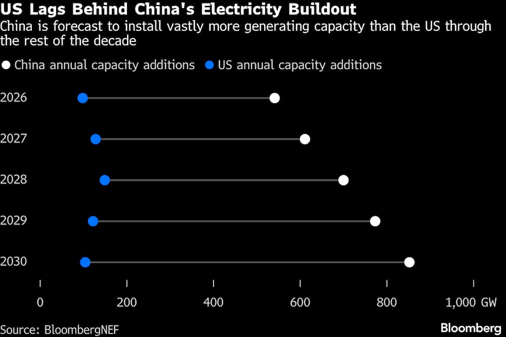 China añadirá más de 3,4 teravatios de capacidad de generación eléctrica en los próximos cinco años, casi seis veces más que EE.UU., según las previsiones de BloombergNEF en su hipótesis de base Economic Transition Scenario. Esa afluencia daría a la economía número 2 una mayor capacidad para acomodar la creciente demanda de energía de los centros de datos.
