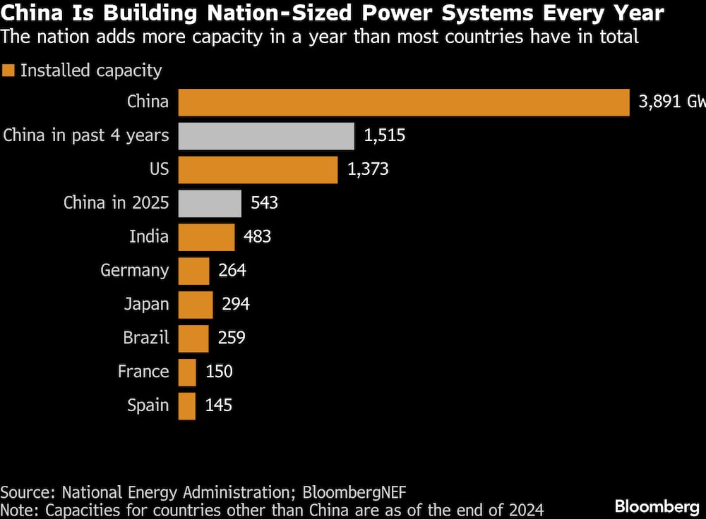 Desde 2021, China ha añadido más capacidad eléctrica en todas las tecnologías energéticas que EE.UU. en toda su historia, incluidos 543 gigavatios el año pasado, según las cifras publicadas a finales del mes pasado por la Administración Nacional de Energía del país.