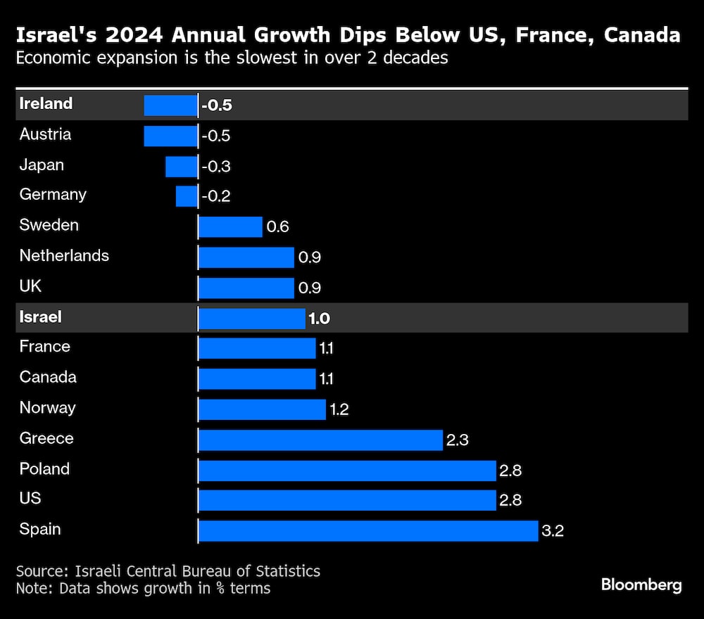 Bloomberg — La economía israelí creció el año pasado a su ritmo más lento en más de dos décadas, excluyendo la pandemia del Covid-19, lo que subraya el peaje de las guerras libradas en Gaza y Líbano durante gran parte del año.