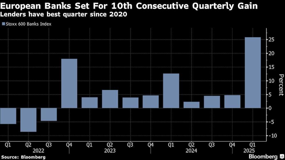 Los prestamistas europeos están teniendo un año arrollador, con el índice Stoxx 600 Banks subiendo un 27% desde principios de año y siendo, con diferencia, el sector con mejores resultados de Europa. El índice se encamina a su décima subida trimestral consecutiva, una racha ganadora que experimentó por última vez antes de la crisis financiera de 2008.