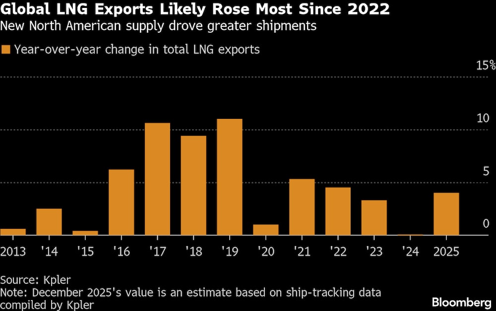 Bloomberg — Las exportaciones mundiales de gas natural licuado en 2025 experimentaron probablemente el mayor salto en tres años, al entrar en funcionamiento la nueva oferta en Norteamérica.