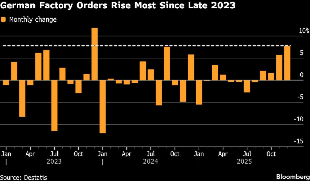 La demanda aumentó un 7,8% en diciembre, más de lo previsto por un solo economista en una encuesta de Bloomberg. Incluso sin los pedidos a gran escala, el indicador habría mejorado un 0,9%, según informó el jueves la oficina de estadística. La quinta ganancia mensual desafió la estimación mediana de la encuesta de Bloomberg, en la que los analistas habían pronosticado un descenso del 2,2%.