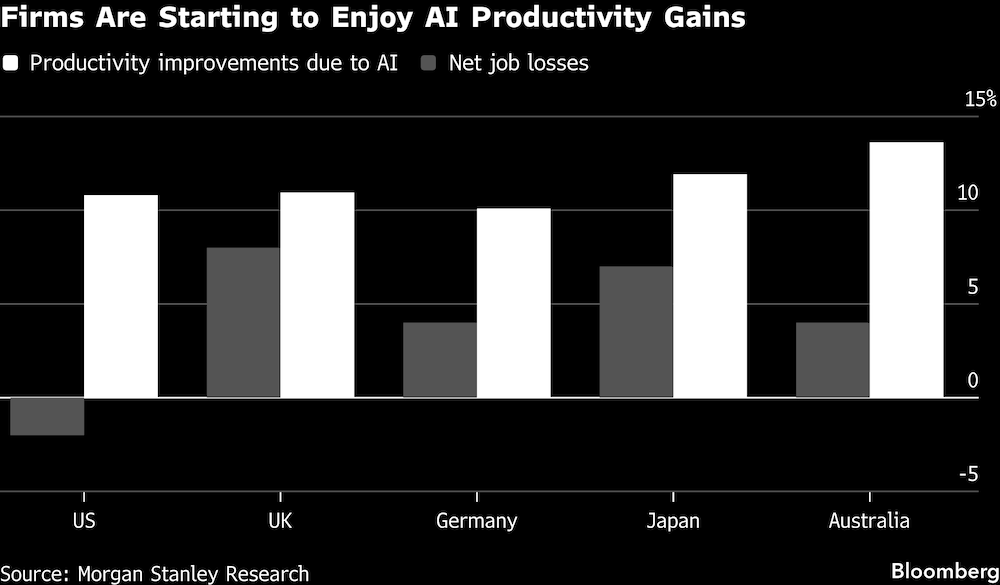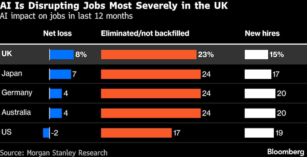 Eso es según una investigación de Morgan Stanley que encontró que los beneficios significativos para las empresas que adoptan la tecnología están llegando a un costo particularmente pesado para los trabajadores en Gran Bretaña, pesando sobre un mercado laboral que ya se está enfriando.
