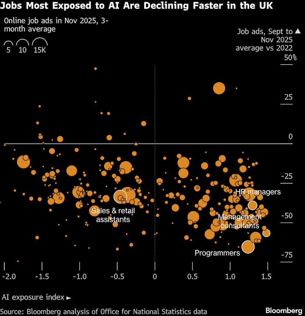 Aunque las ofertas de empleo están disminuyendo en general, las empresas británicas están reduciendo a un ritmo más rápido las ocupaciones que probablemente se verán afectadas por la IA, como los desarrolladores de software o los consultores, según un análisis de Bloomberg de las cifras de vacantes en línea de la Oficina de Estadísticas Nacionales. Desde 2022, cuando se lanzó el ChatGPT de OpenAI, las vacantes para este tipo de empleos han caído un 37%, frente a un descenso del 26% en el resto del mundo.