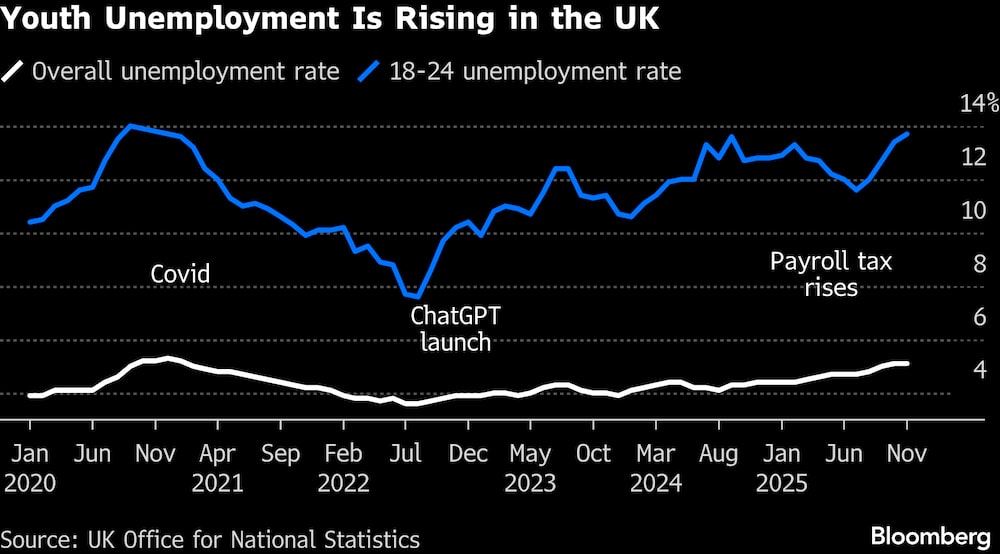 Los trabajadores más jóvenes del Reino Unido se están viendo presionados por ambos lados, ya que la IA trastorna los puestos de cuello blanco de nivel básico, mientras que las políticas fiscales laboristas lastran la contratación en el comercio minorista y la hostelería. El desempleo juvenil ha aumentado más rápido que la tasa general, alcanzando el 13,7% en los tres meses hasta noviembre, el más alto desde 2020.