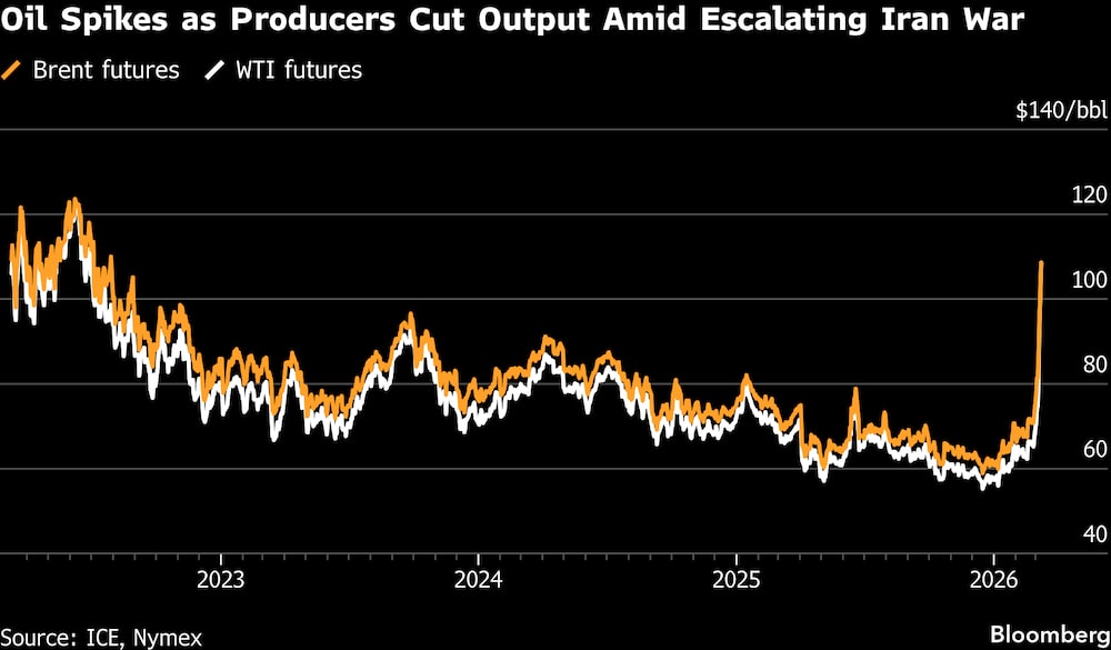 Bloomberg — El petróleo subió por encima de los US$100 el barril por primera vez desde 2022 y las acciones retrocedieron ante la escalada de las hostilidades en Medio Oriente y la creciente presión sobre el transporte marítimo y las infraestructuras petrolíferas, que han hecho que los inversores se preparen para nuevas turbulencias. El dólar avanzó.