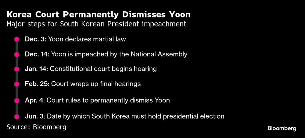 Bloomberg — Un tribunal surcoreano destituyó al presidente Yoon Suk Yeol por su desafortunada declaración de la ley marcial, allanando el camino para una carrera presidencial que ponga fin a un vacío de liderazgo que se ha apoderado de la nación durante meses.