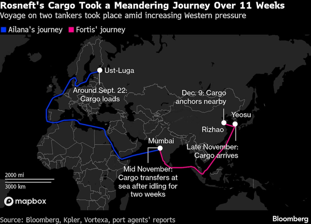Bloomberg — Un cargamento de petróleo ruso de Rosneft PJSC, sancionada por EE.UU., ha llegado a aguas chinas tras un largo y serpenteante viaje que incluyó un inusual trasbordo de petroleros frente a la India y una breve parada cerca de Corea del Sur.