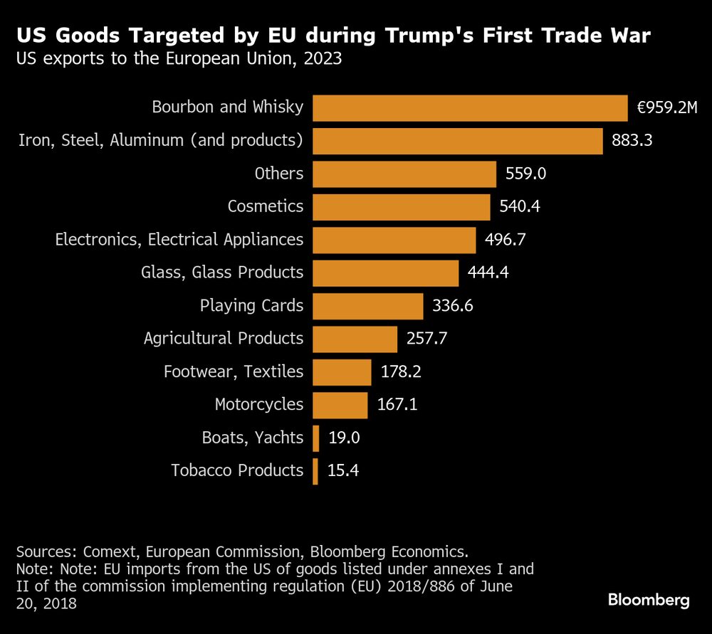 El bloque de 27 naciones reaccionó apuntando a empresas políticamente sensibles con aranceles de represalia, incluidas las motocicletas Harley-Davidson Inc. y los vaqueros Levi Strauss & Co. Las medidas se aplicaron producto por producto e incluyeron bienes agrícolas y prendas de vestir, además de productos de acero y aluminio.