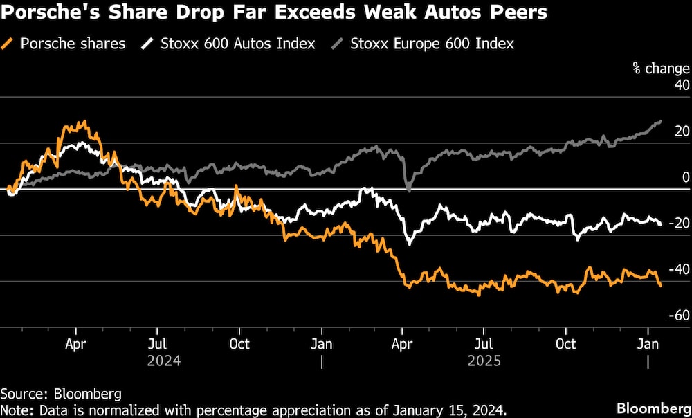 Las acciones del fabricante del 911 están a punto de registrar la peor semana de su historia, con una caída del 10%. Se encuentran entre los valores más débiles de un sector más amplio cuya caída no se ha frenado durante la mayor parte de los dos últimos años.