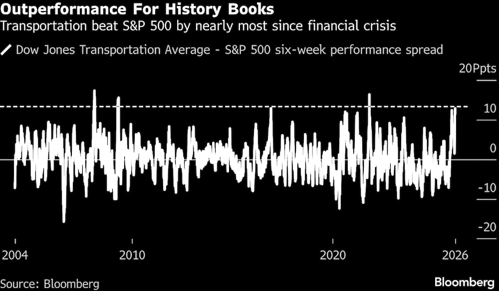 Después de años de ir a la zaga de los principales índices de referencia de la renta variable estadounidense, el Promedio Dow Jones de Transporte está a la cabeza, superando al Índice S&P 500 en 13 puntos porcentuales en el último mes y medio, casi lo máximo desde la crisis financiera. El indicador, que contiene a incondicionales del sector como CSX Corp., FedEx Corp. (FDX) y Old Dominion Freight Line Inc. e incluso United Airlines Holdings Inc. (UAL), se ha visto catapultado al alza por unos datos sólidos y un giro que le aleja de los grandes ganadores tecnológicos de los últimos años.