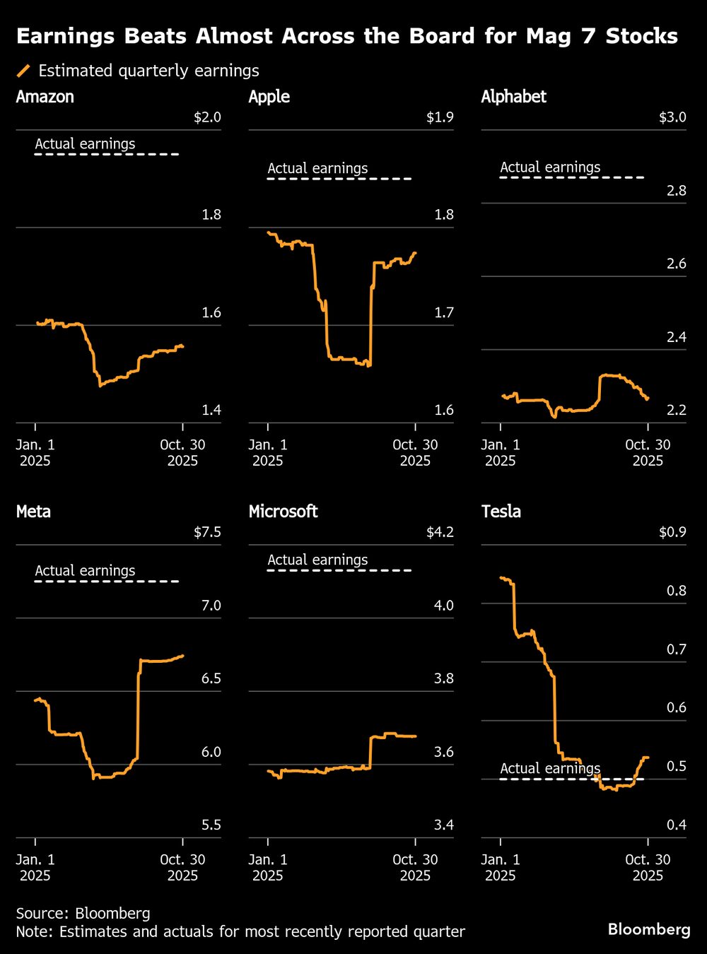 Con los informes de ganancias ya en seis de los llamados Siete Magníficos, que también incluye a Tesla Inc (TSLA), el crecimiento de los beneficios trimestrales está rastreando en torno al 27% para el grupo, en comparación con la expansión del 15% prevista antes de que comenzara la temporada de presentación de informes, según datos compilados por Bloomberg Intelligence.