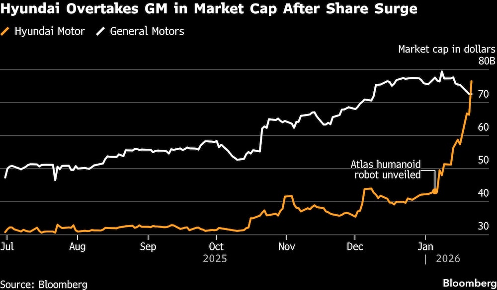 Bloomberg — Hyundai Motor Co. superó a General Motors Co. (GM) como el cuarto fabricante de automóviles más valioso del mundo, ya que el impulso de la robótica de la firma surcoreana alimenta una fulgurante subida de sus acciones.