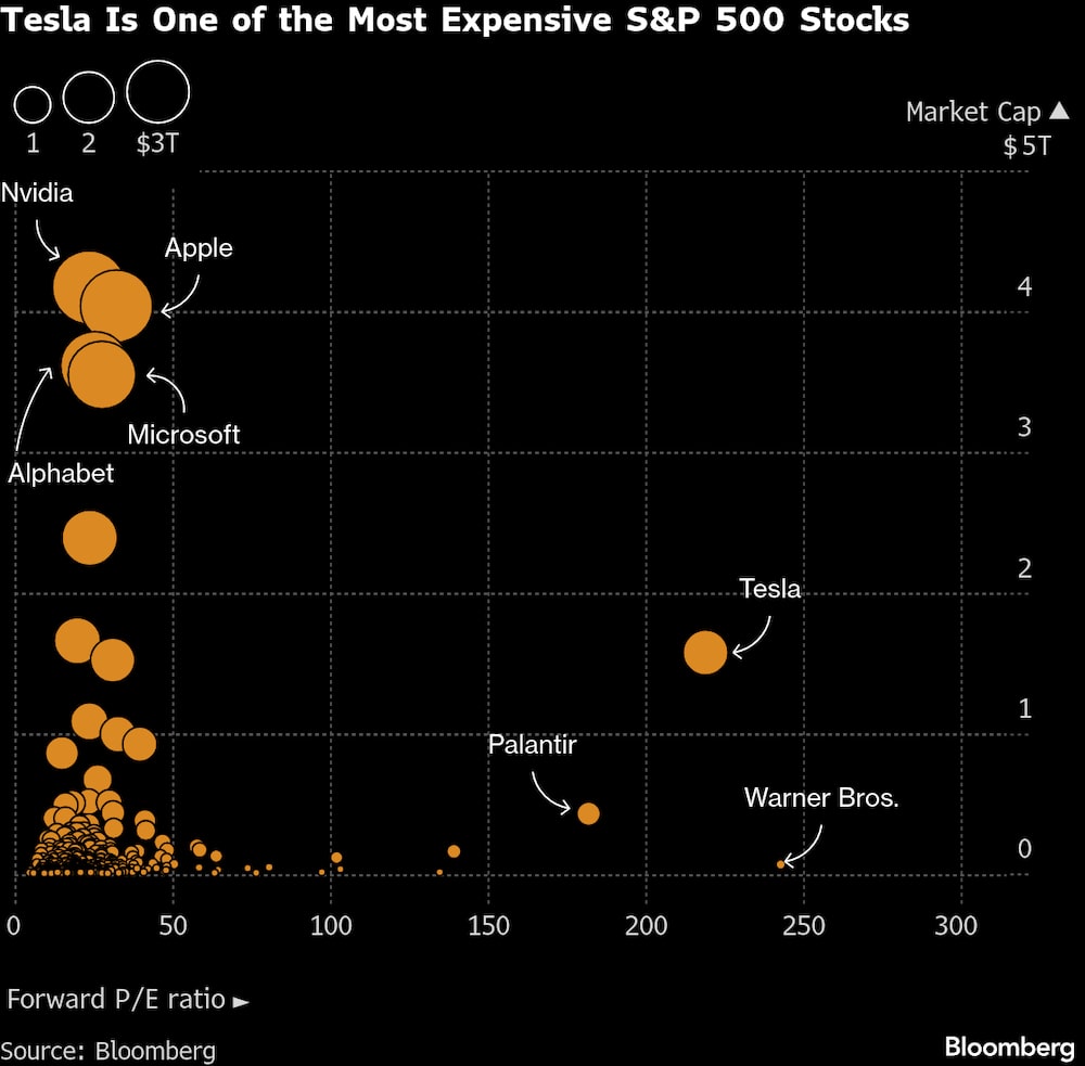 El repunte es un testimonio de la fe de Wall Street en las ambiciones de inteligencia artificial de Musk, sobre todo porque el negocio principal de automóviles de Tesla está pasando por dificultades. Pero también ha encarecido enormemente las acciones de Tesla. A unas 220 veces los beneficios en los próximos 12 meses, la acción tiene la segunda valoración más alta del S&P 500, solo por detrás de Warner Bros Discovery Inc. (WBD) y muy por delante de la número tres, Palantir Technologies Inc. (PLTR).