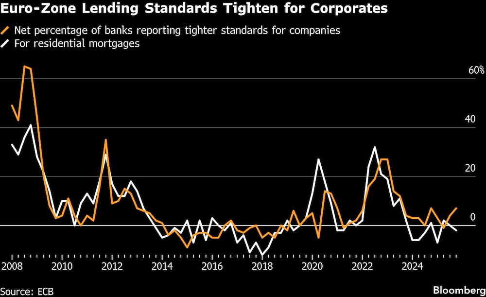 “Las preocupaciones sobre las perspectivas de las empresas y de la economía en general, así como la menor tolerancia al riesgo de los bancos, contribuyeron” a la medida, dijo el BCE el martes en su Encuesta sobre Préstamos Bancarios del cuarto trimestre.