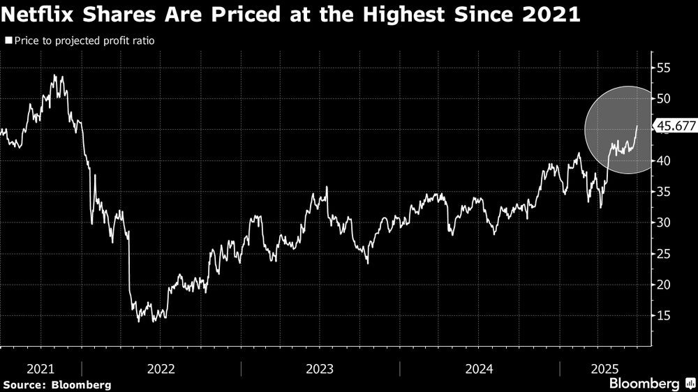 El precio de las acciones del gigante del streaming casi se ha duplicado en los últimos 12 meses gracias al crecimiento de las ventas publicitarias, el aumento de los precios de las suscripciones y la limitada exposición a los aranceles. Si bien eso la convierte en uno de los miembros del S&P 500 con mejor rendimiento en ese periodo, también ha elevado su valoración a 46 veces los beneficios previstos para el próximo año. En comparación, Nvidia Corp (NVDA) cotiza a 32 veces, mientras que el Nasdaq 100 lo hace a 27 veces.