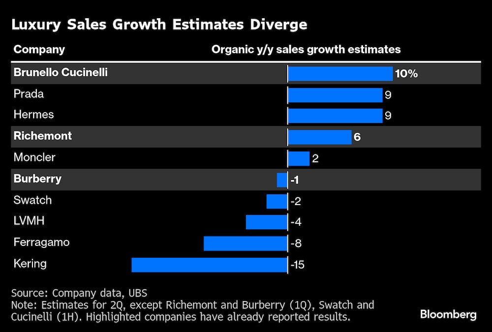 Un ejemplo llamativo de la división del sector es LVMH frente a su par francés Hermes International SCA. Se espera que las ventas de la división clave de Moda y Marroquinería de LVMH hayan caído un 7,8% en el segundo trimestre, según las estimaciones de los analistas. La compañía informa después de la campana el jueves. Se espera que Hermes, que ha sido un ejemplo de cómo las empresas pueden prosperar vendiendo los artículos de gama más alta, registre un crecimiento de los ingresos del 12% en su división de marroquinería. Sus resultados están previstos para el 30 de julio.