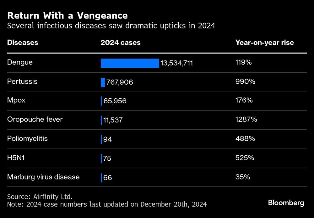 A finales de diciembre, el mundo vio saltar los casos de dengue a un nuevo récord de más de 13 millones, más del doble que el año pasado, ya que las infecciones casi se triplicaron en América Central y del Sur, y mataron a casi 10.000 personas en todo el mundo este año. Los casos de tos ferina, también conocida como tos convulsa, aumentaron casi 10 veces el número total de 2023. Muchas otras, como el mpox, la fiebre oropouche y la poliomielitis, también aumentaron.