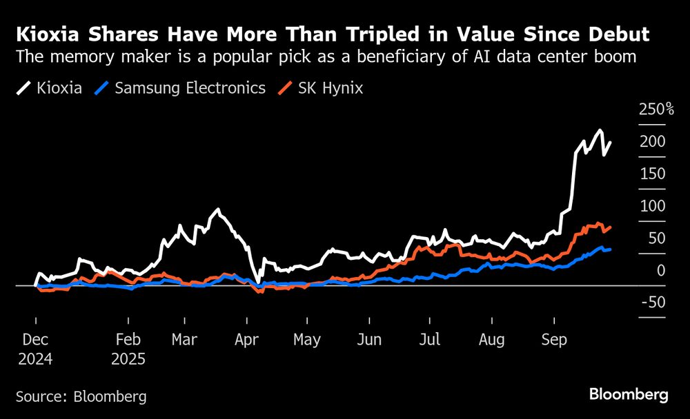 Junto a los fabricantes surcoreanos de memorias Samsung Electronics Co. y SK Hynix Inc., Kioxia ha disparado este año su valor a medida que los inversores buscan más beneficiarios del auge de las infraestructuras de inteligencia artificial. Sus acciones se han más que triplicado desde su debut público en Tokio en diciembre.