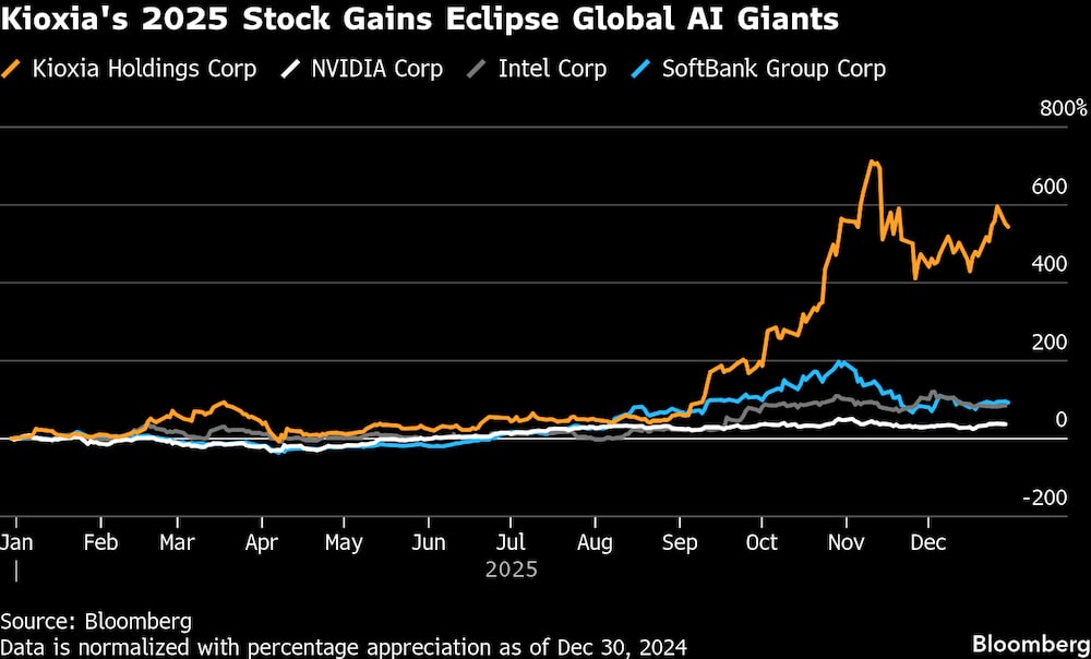 Las acciones de Kioxia han subido alrededor de un 540% en lo que va de año, superando a todos los demás miembros del índice MSCI World y convirtiéndose en la acción más alta del índice de referencia japonés Topix para 2025. El fabricante de memorias flash NAND, que no debutó en la Bolsa de Tokio hasta el pasado mes de diciembre, cuenta con Apple Inc. (AAPL) y Microsoft Corp. (MSFT) entre sus clientes y su valor actual ronda los 5,7 billones de yenes (US$36.000 millones).