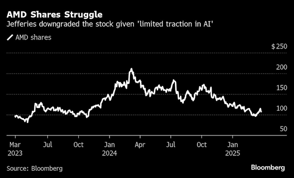 Bloomberg — Advanced Micro Devices Inc (AMD) se está quedando más rezagada que Nvidia Corp (NVDA) en sus capacidades tecnológicas, un hecho que podría seguir presionando a la acción, según Jefferies, que rebajó la calificación del fabricante de chips a mantener.