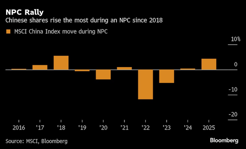 Las acciones chinas registraron su mejor rendimiento durante la reunión anual desde 2018, con el índice MSCI China cotizando un 4,3% al alza durante el evento de una semana de duración y registrando una modesta ganancia el martes, cuando la mayoría de las acciones asiáticas cayeron.